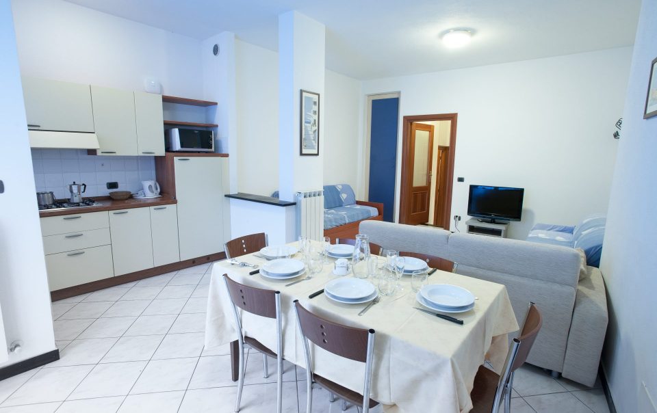 Appartamento al piano terra con camera doppia, due divani letto, bagno con doccia e cortile privato.
